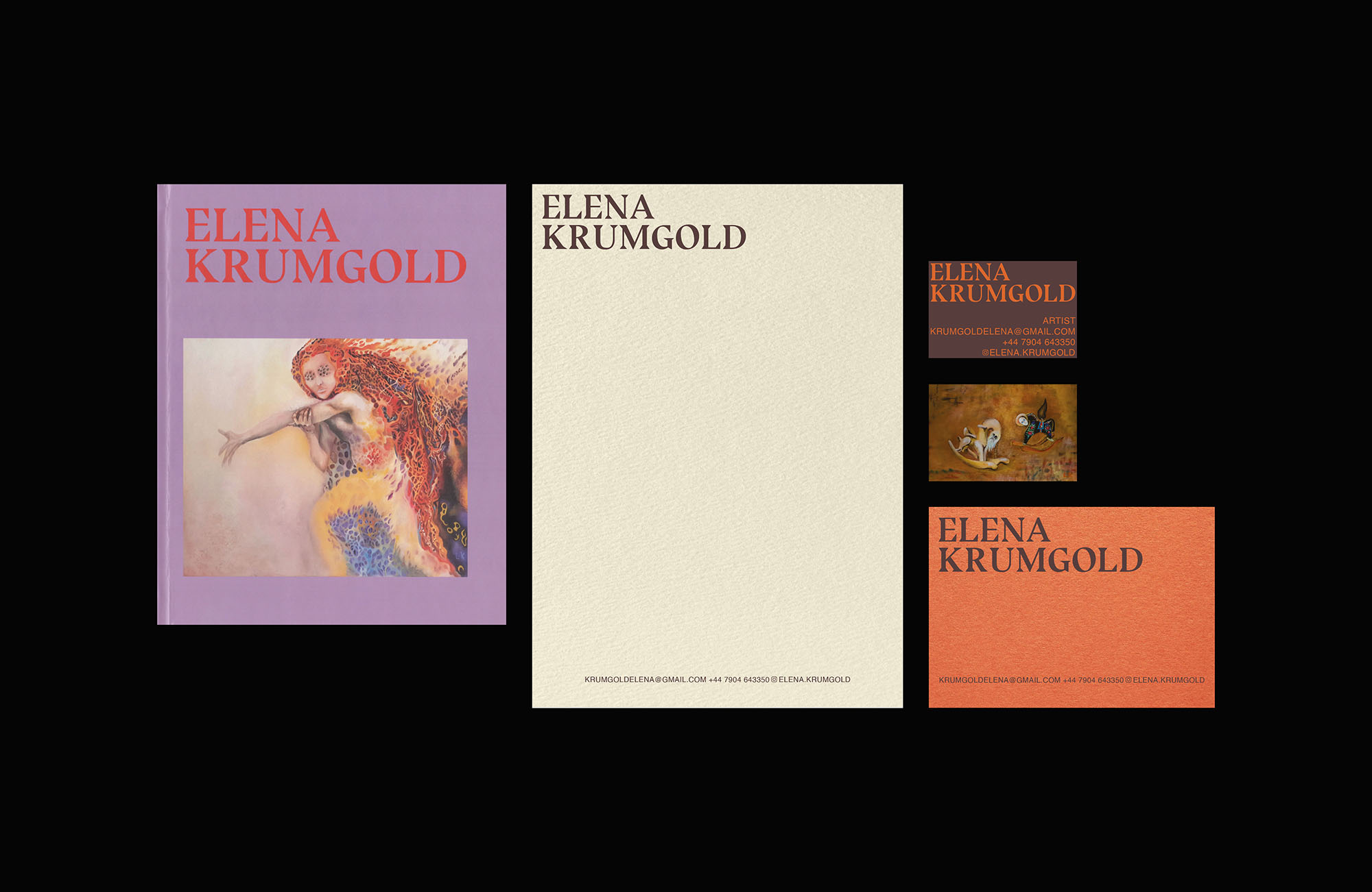 Visual identity and art catalogue design for a Worthing-based fine artist, Elena Krumgold. As a response to the artist's need to showcase her work to the buyers and galleries, both digital and print art catalogue versions were produced alongside branded print collateral. The choice of paper colours and bold typography were influenced by the artist’s paintings and the signature colours used in her work.
